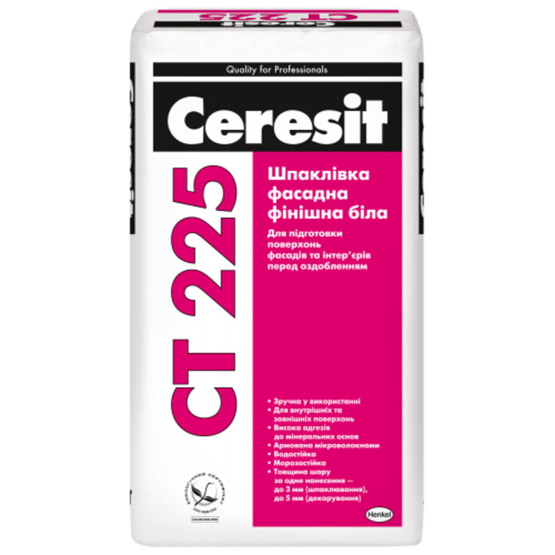 Шпаклівка Ceresit СТ 225 призначена для підготовки бетонних, цегляних, цементно-піщаних, цементно-вапняних підстав під оздоблення всередині і зовні будинків. Ефективна при ремонті тріщин, раковин, виїмок і інших дефектів на поверхні підстав глибиною до 3 мм. Рекомендується для оздоблення фасадів та інтер'єрів зі створенням різних фактур.