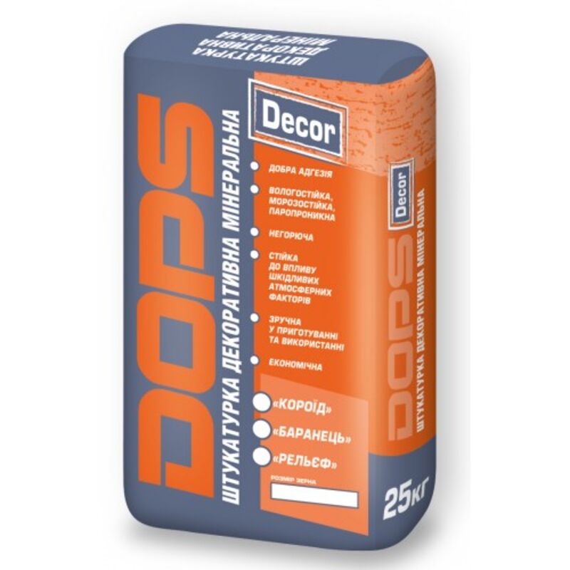 Штукатурка мінеральна структурна DOPS Decor - готова суха декоративна штукатурна суміш для виконання оздоблювальних штукатурних робіт по рівних несучим гідрофільних підставах, стійким до деформації (цегла, легкий бетон, бетон, цементно-вапняна або цементна штукатурка, клейовий армований шар у системах утеплення та ін.) як всередині сухих і вологих приміщень, так і зовні. Готова поверхня штукатурки має рельєфний вид - структура «Короїд», «Баранчик», «Рельєф». Розмір зерна від 1,5 мм до 5 мм (див. На лицьовій стороні упаковки)