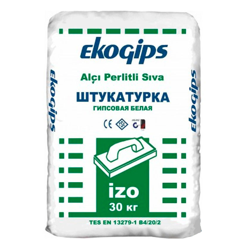 Гіпсова шпаклівка EKOGIPS IZOGIPS (Екогіпс Ізогіпс) 30кг володіє високим ступенем тепло - і звукоізоляції, а також придатний для накладки на стелі, кирпичнние, Бетонні та газобетонні основи. Пропорція води і гіпсу: 10кг на 6л води. Витрата: 9-9, 5 кг / м при товщині 1см