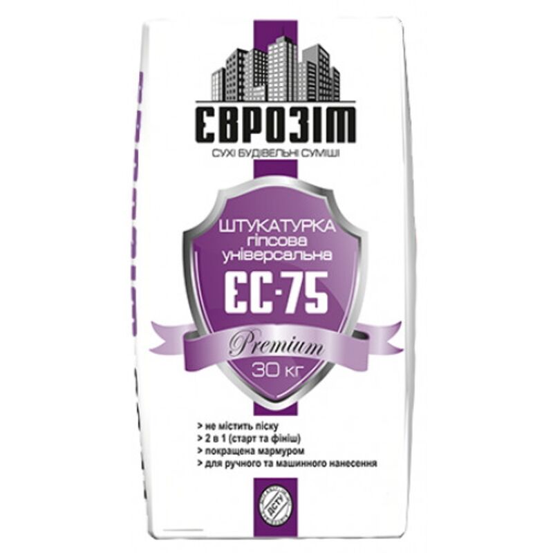 Гіпсова штукатурка Єврозит ЄС-75 відноситься до універсальних штукатурних сумішей, які застосовуються як для стартового вирівнювання поверхонь стін з незначними дефектами, так і для фінішного доведення перед нанесенням декоративних покриттів: фактурних фарб, шпалер, тонкошарових лакофарбових покриттів. Застосувується у приміщеннях з нормальною вологістю.
